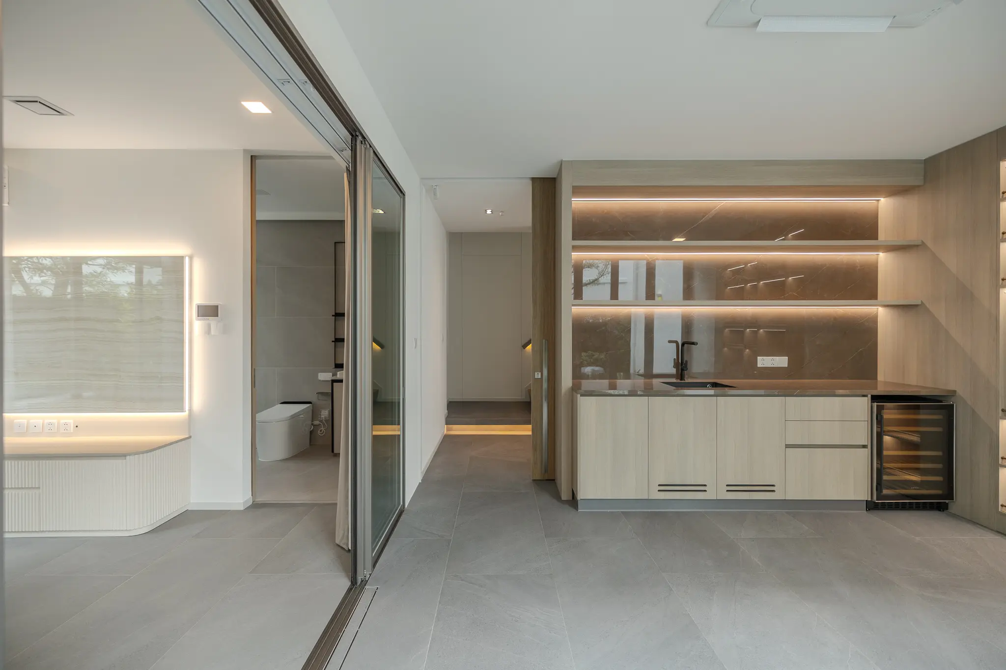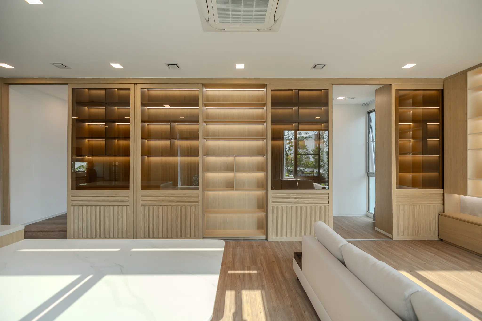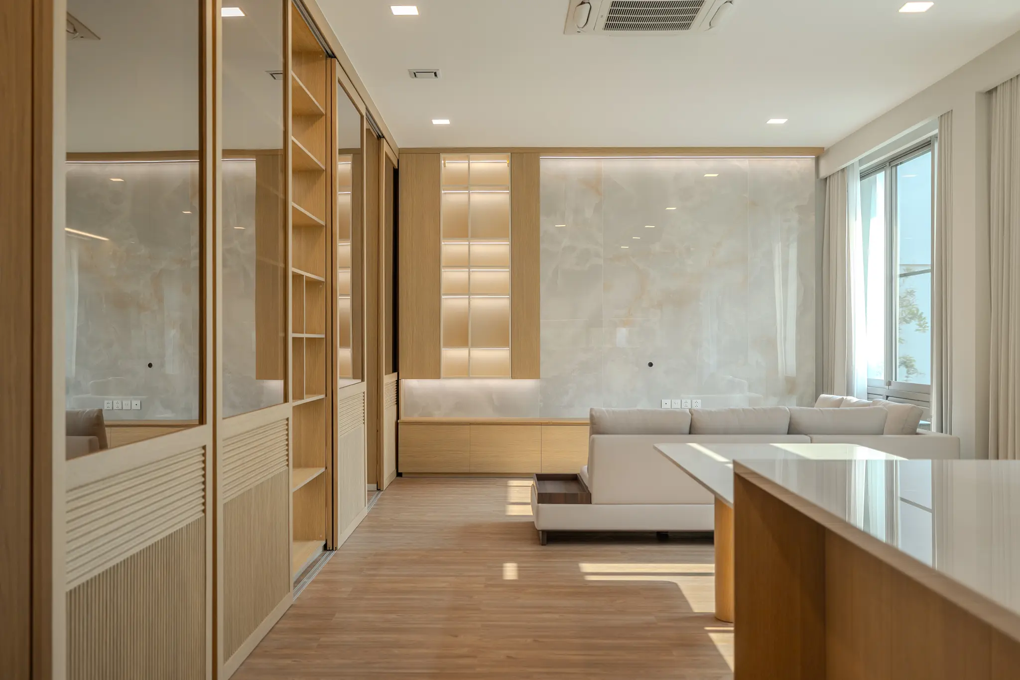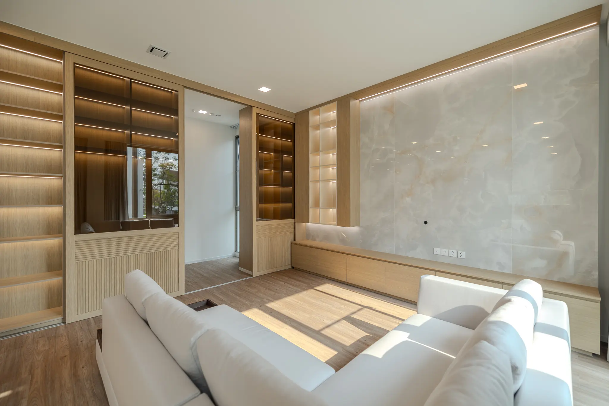 A bright and elegant living room with warm wood shelving, soft lighting, and a large marble-effect feature wall. The neutral-toned sofa enhances the clean and modern atmosphere.