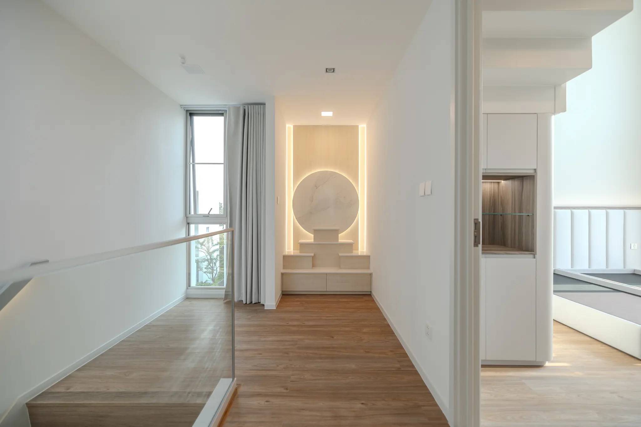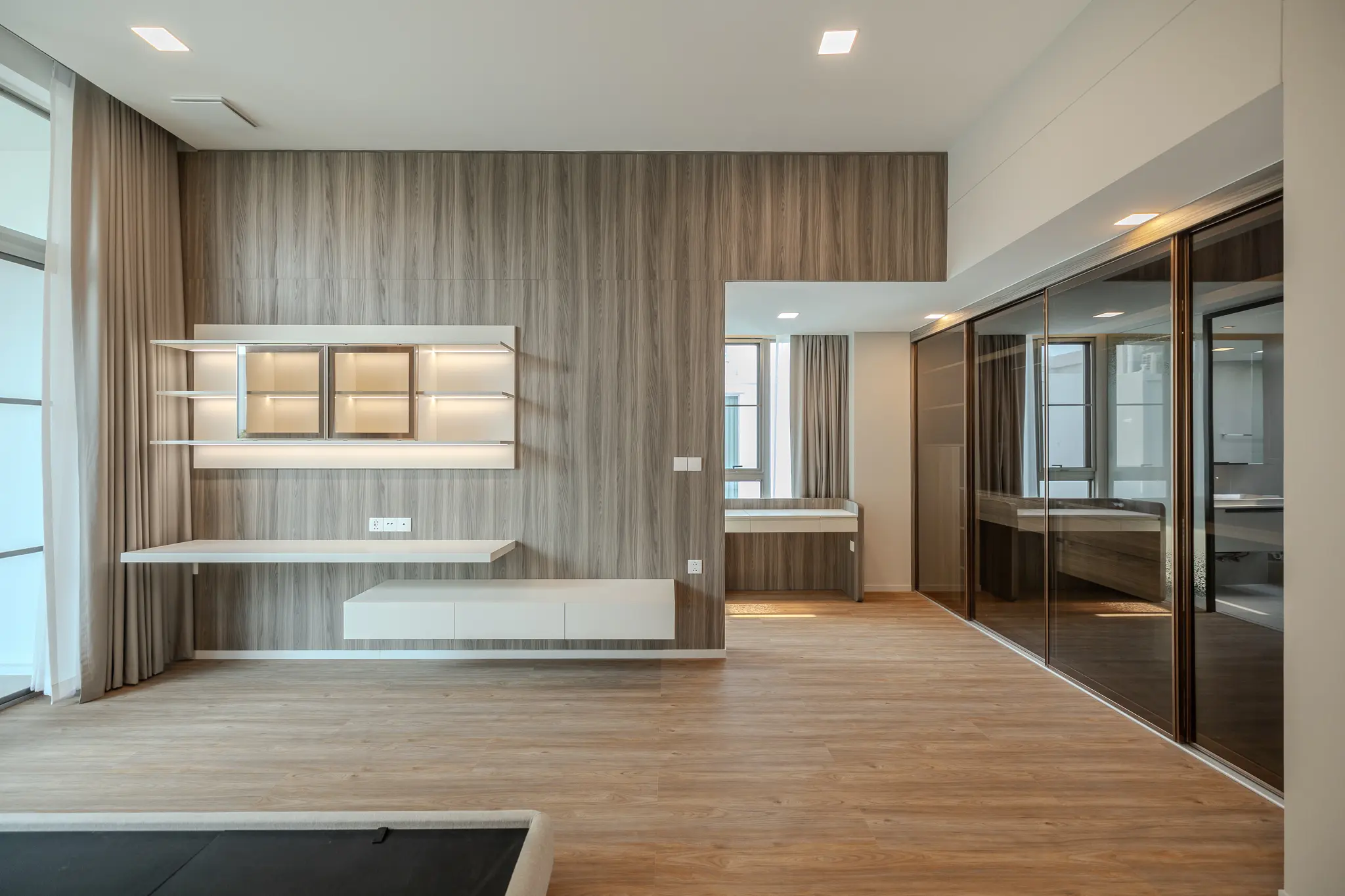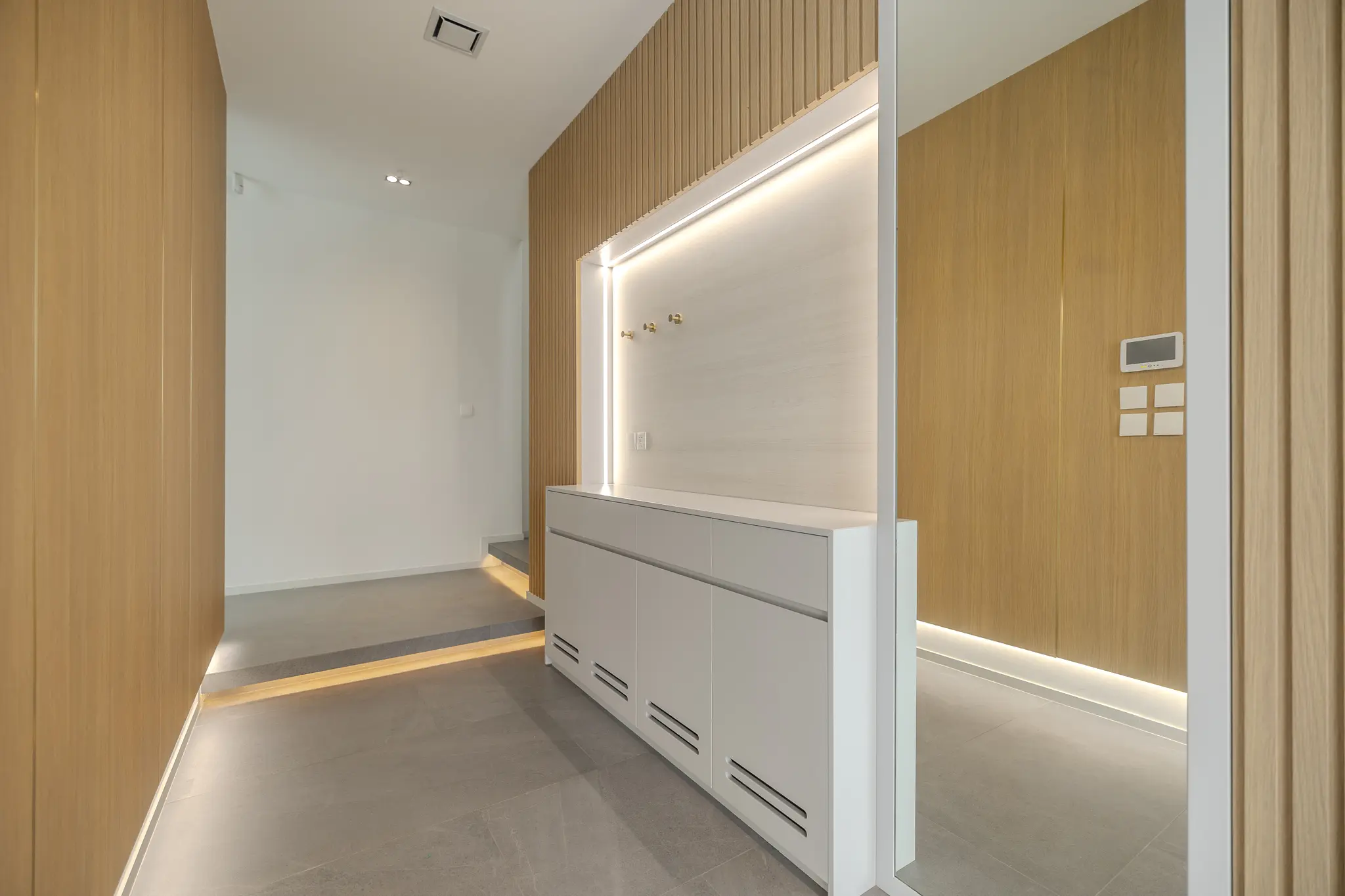 A bright and elegant living room with warm wood shelving, soft lighting, and a large marble-effect feature wall. The neutral-toned sofa enhances the clean and modern atmosphere.