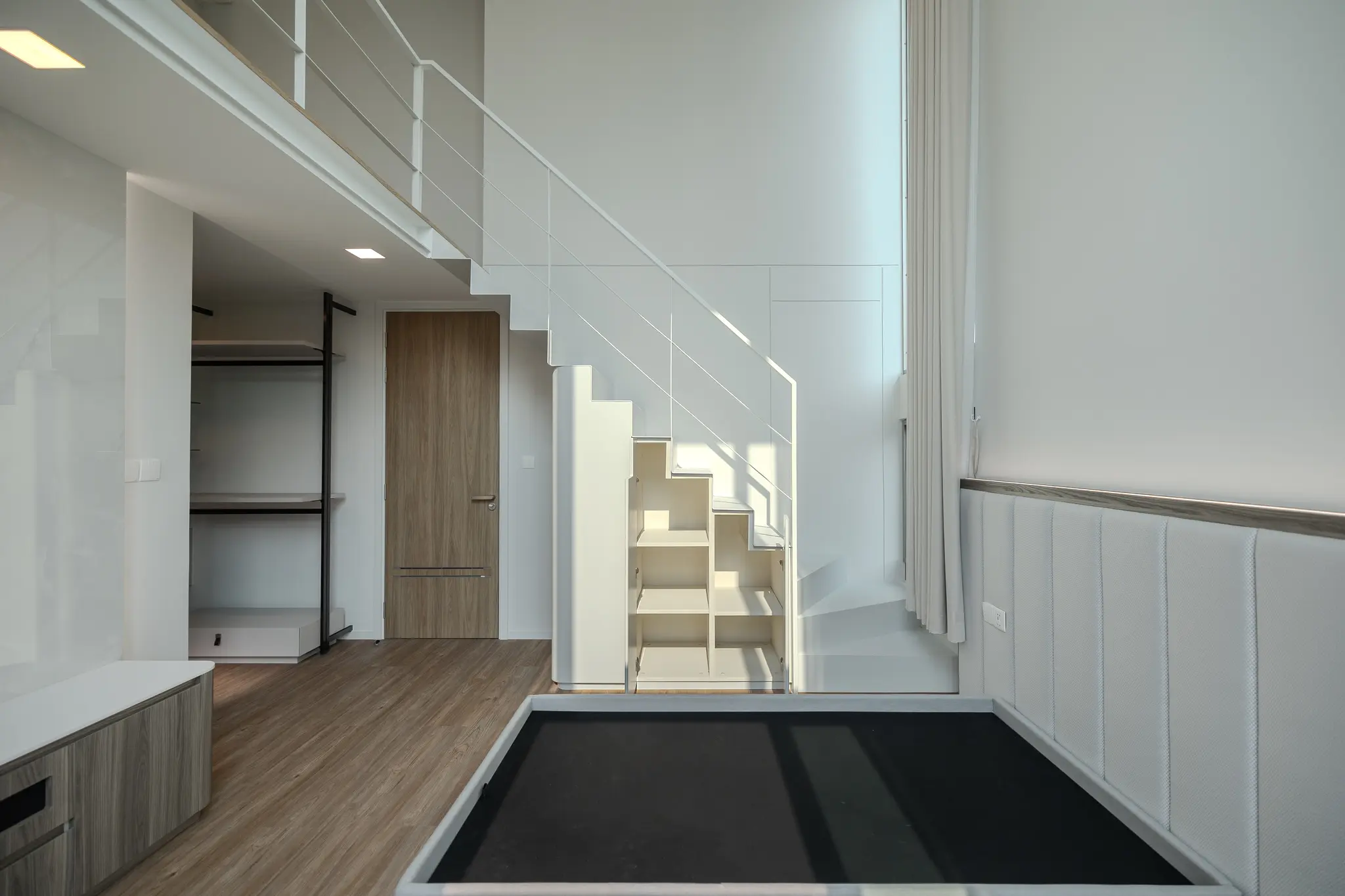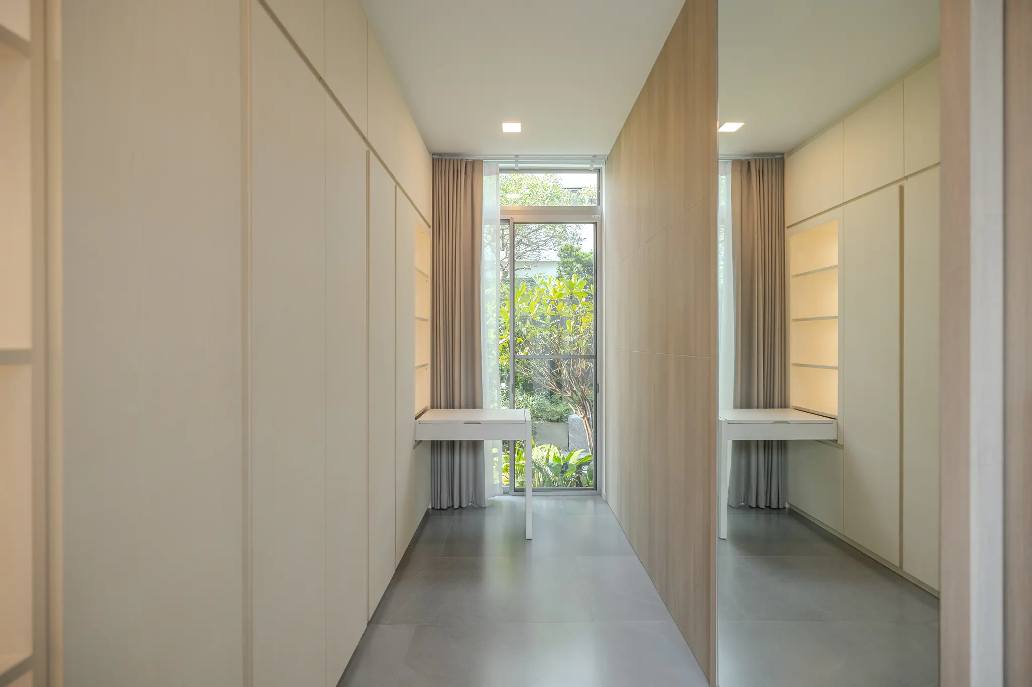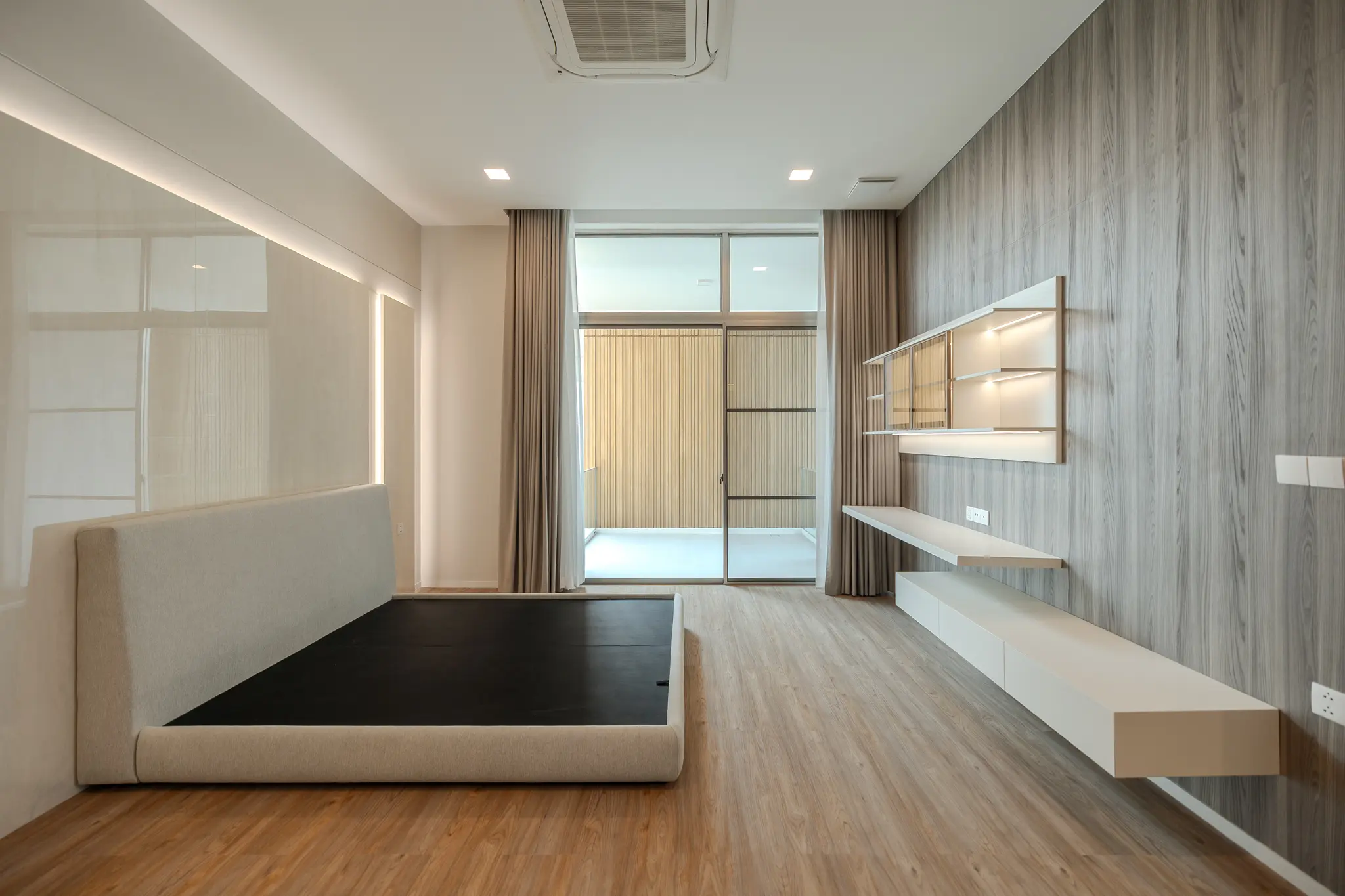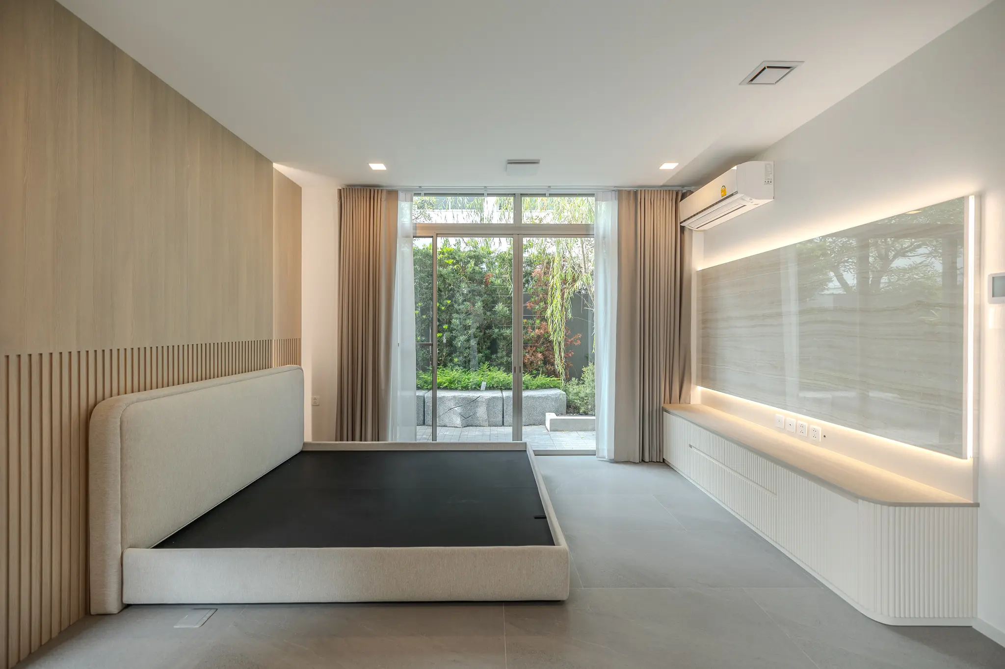 A bright and elegant living room with warm wood shelving, soft lighting, and a large marble-effect feature wall. The neutral-toned sofa enhances the clean and modern atmosphere.